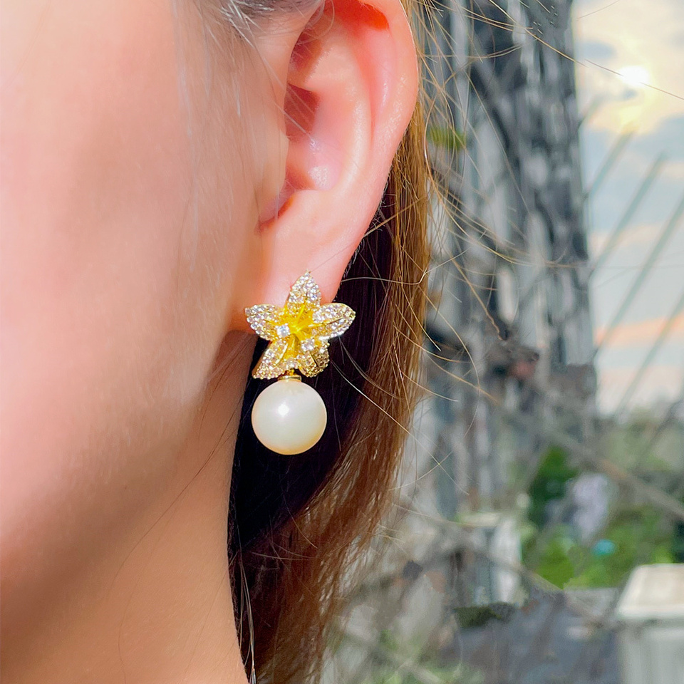 Noble Gold Plated Dangle Drop Pearl Cubic Zirconia Geometric Flower Earrings