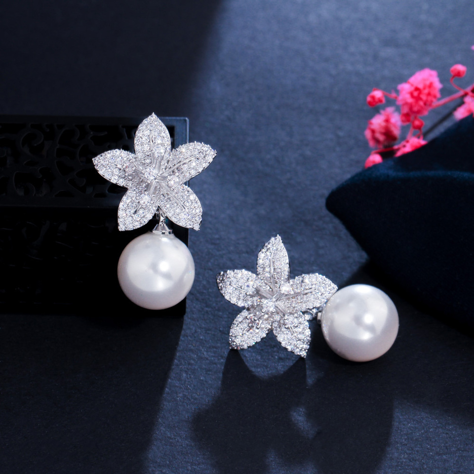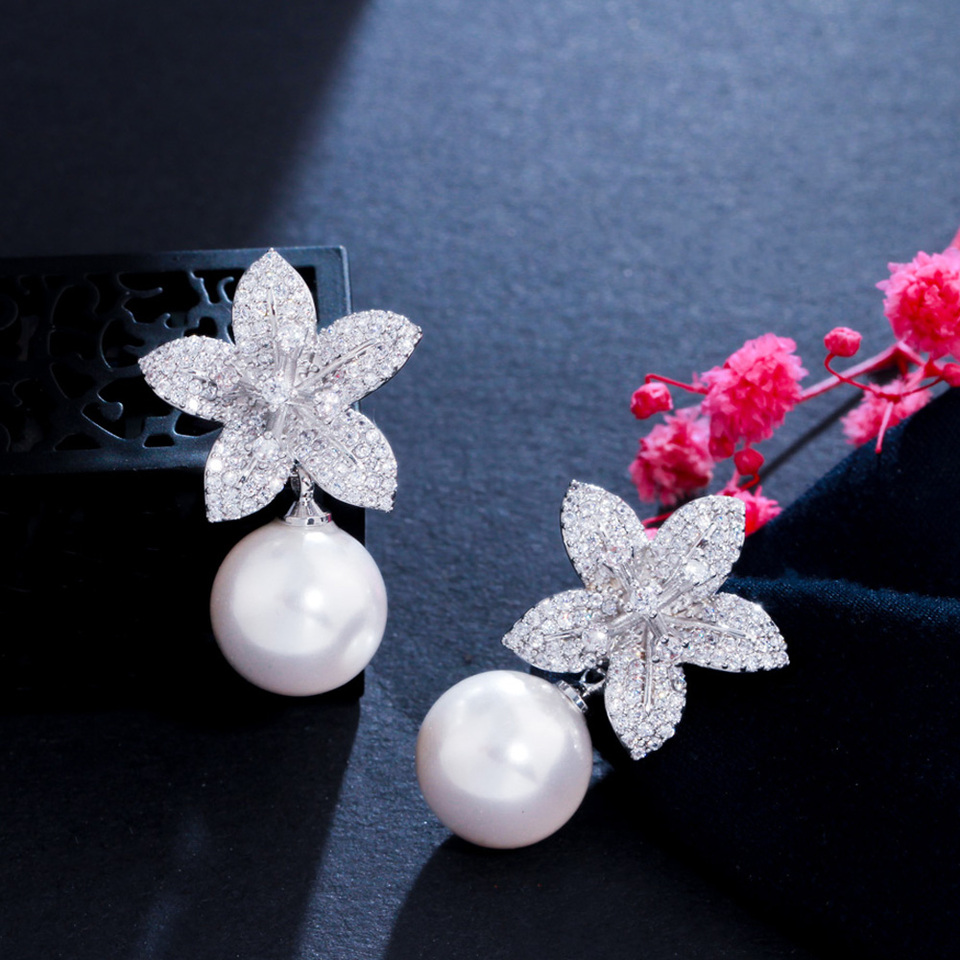 Noble Silver Dangle Drop Pearl Cubic Zirconia Geometric Flower Earrings