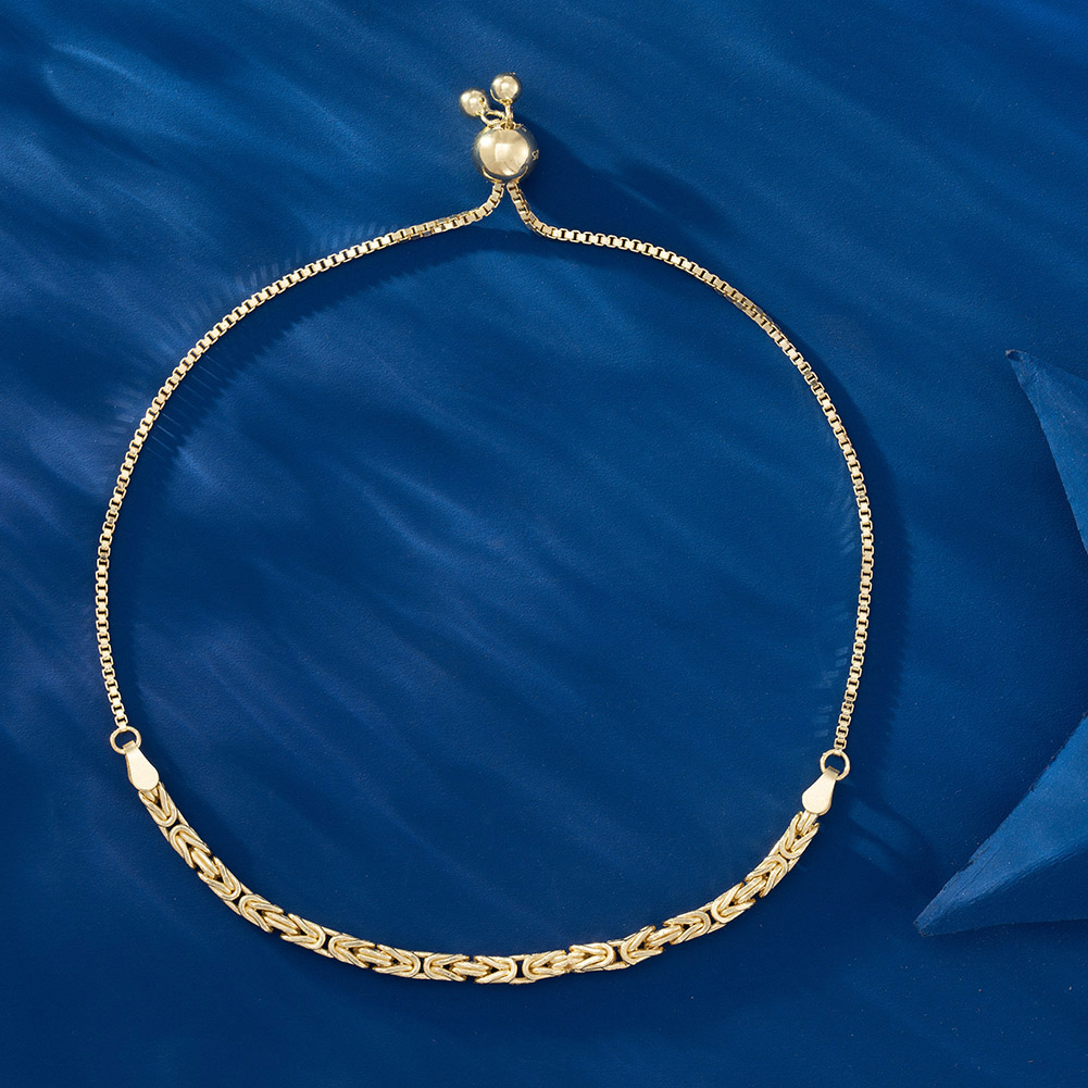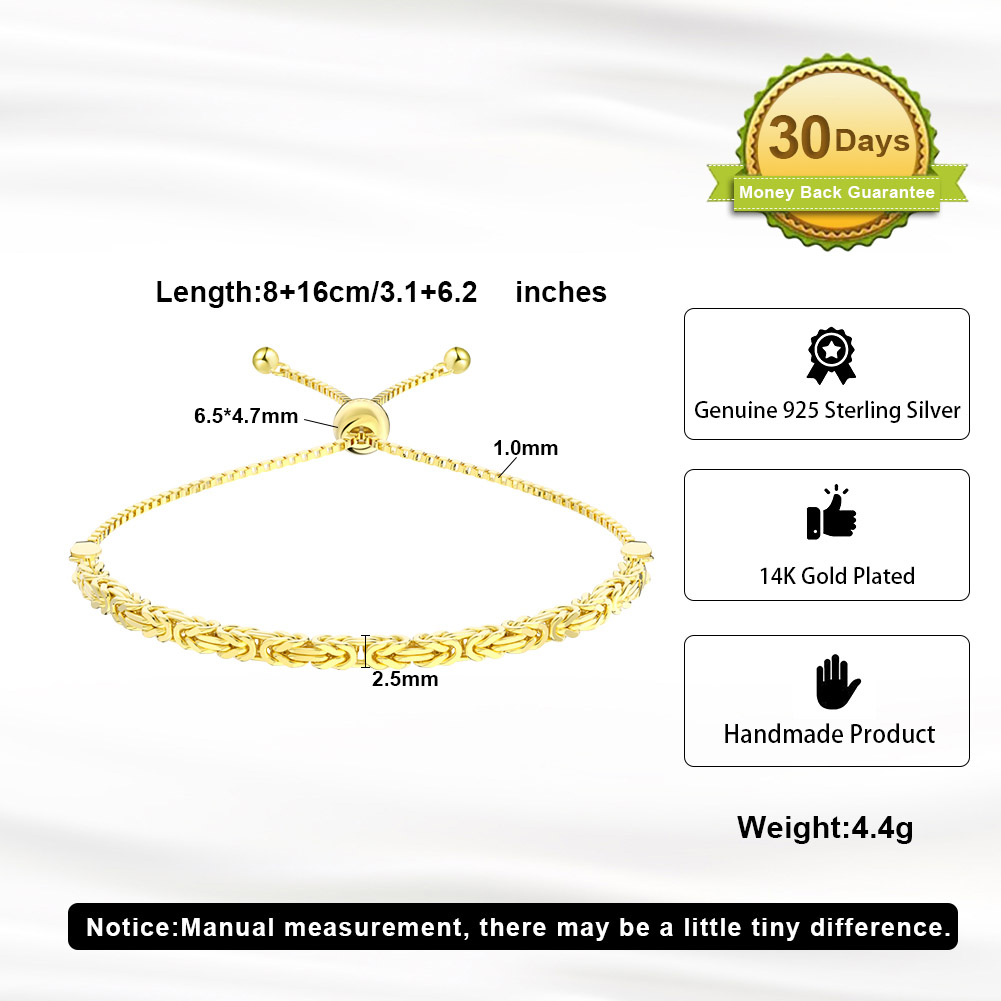 Real 925 Sterling Silver 14K Gold Plated Square Byzantine Box Chain Adjustable Bracelet