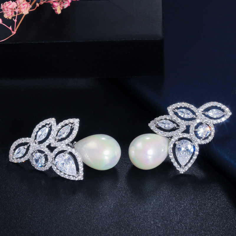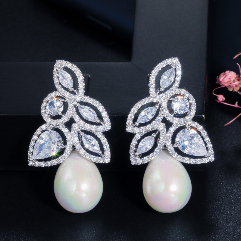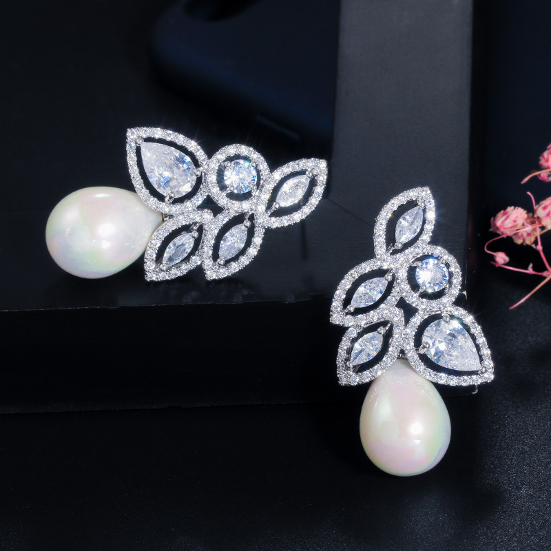 Vintage Flower Leaf Sparkling Silver Cubic Zirconia Filled Dangle Drop Pearl Earrings
